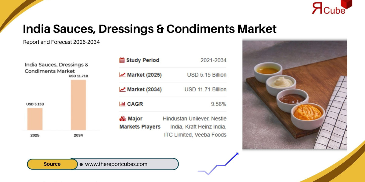 The India Sauces, Dressings & Condiments Market is projected to reach USD 11.71 Billion by 2034, expanding at a compound annual growth rate (CAGR) of 9.56% during the forecast period 2026-2034. According to the latest industry analysis published by The Report Cube, the market was valued at USD 5.15 Billion in 2025.